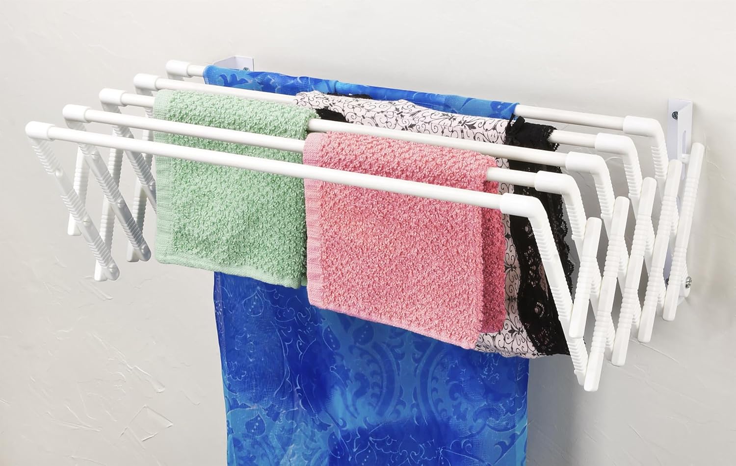 Mdesign expandable wall mount laundry drying rack clothing storage. Polder expandable laundry drying rack. Mount our handy expandable clothes/towel drying rack in your laundry room, basement, attic, or on any door or wall! It can easily be placed on any balcony, fence, rv, pool shed or in your laundry room or basement. Expandable wall mountable clothes drying rack by jumbl: